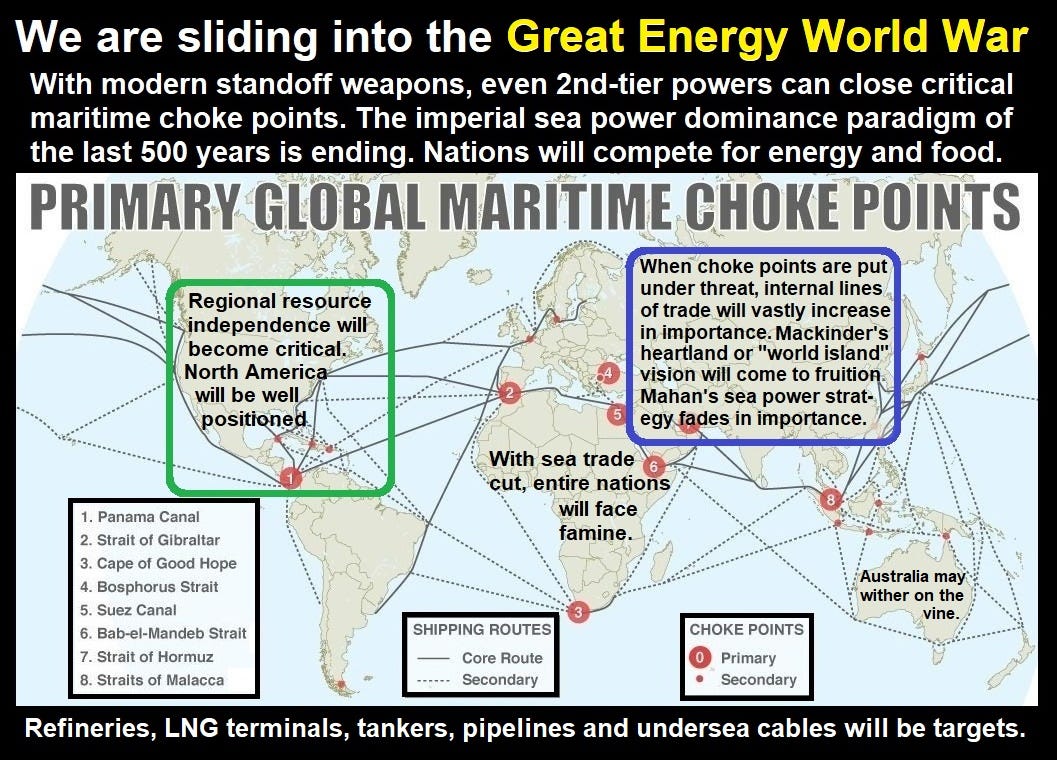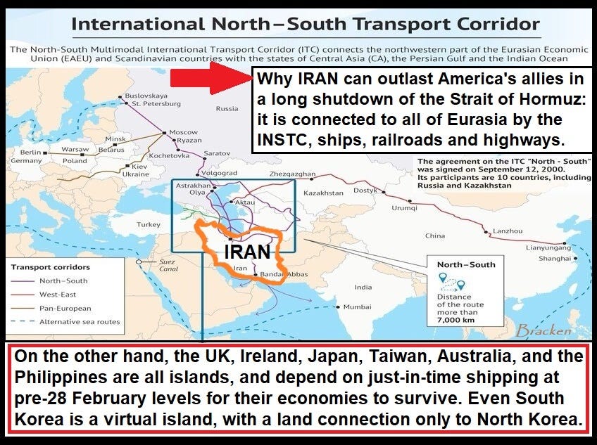 On the other hand, America’s allies, the UK, Ireland, Japan, Taiwan, the Philippines, Australia and New Zealand are island nations, and the closure of the SoH is an absolute catastrophe for them. South Korea is a “virtual island” because it’s only connected to North Korea.