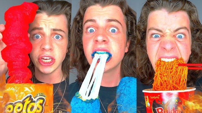 To illustrate what I mean, let me point you to a popular content creator named Luke. He’s got nearly three million followers on Instagram and tens of millions of subscribers on YouTube. Luke posts the same kind of video with very little variation. Each one consists of him scarfing down food, often something that appears to be very spicy, oversized, and bizarre, like a corndog covered in Fruity Pebbles or a giant “Cheeto” covered in several different kinds of hot powders and sauces. Most of the giant weird stuff he eats looks like it’s made out of rice or corn syrup.