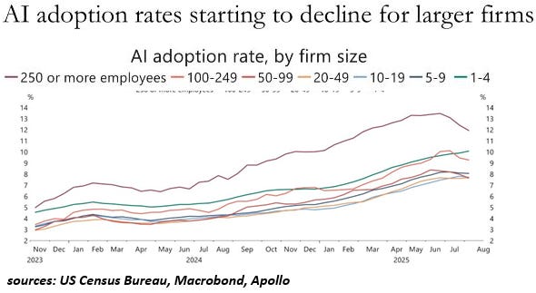 3. The rate at which major companies are adopting AI is rolling over. This chart reflects the peak of euphoria has been reached by those with the most resources to figure that out and the real-world utility of AI tools is yet to be determined.