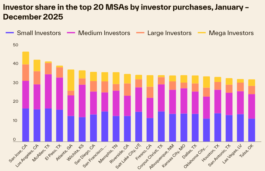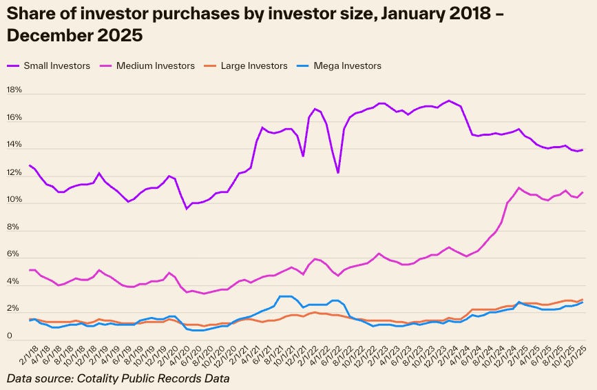 While investors made up 30 percent of nationwide home purchases in 2025, according to Cotality’s data, large investors (more than 100 homes) and mega investors (more than 1,000) represent just 3 to 6 percent of all housing sales since 2018.