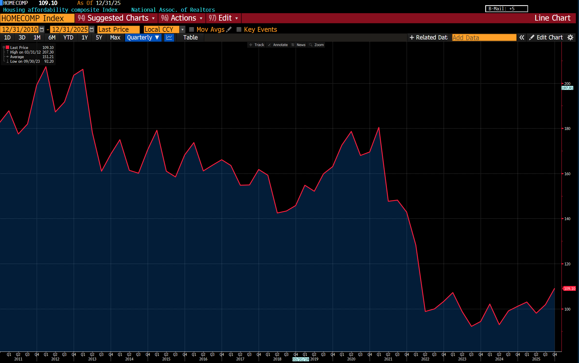 The index hit a record low of 92.2 in 2023 and, despite a modest rebound as rates cooled, the current 109.1 rate remains well under the historical average since 1986 of 136.95.