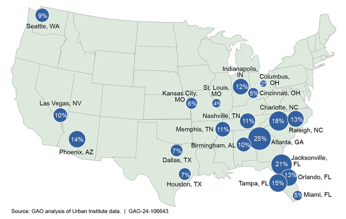 Other markets where institutional investors dominate single-family rental housing stock include Atlanta (25 percent); Jacksonville, Fla. (21 percent); Charlotte, NC (18 percent); and Tampa (15 percent).